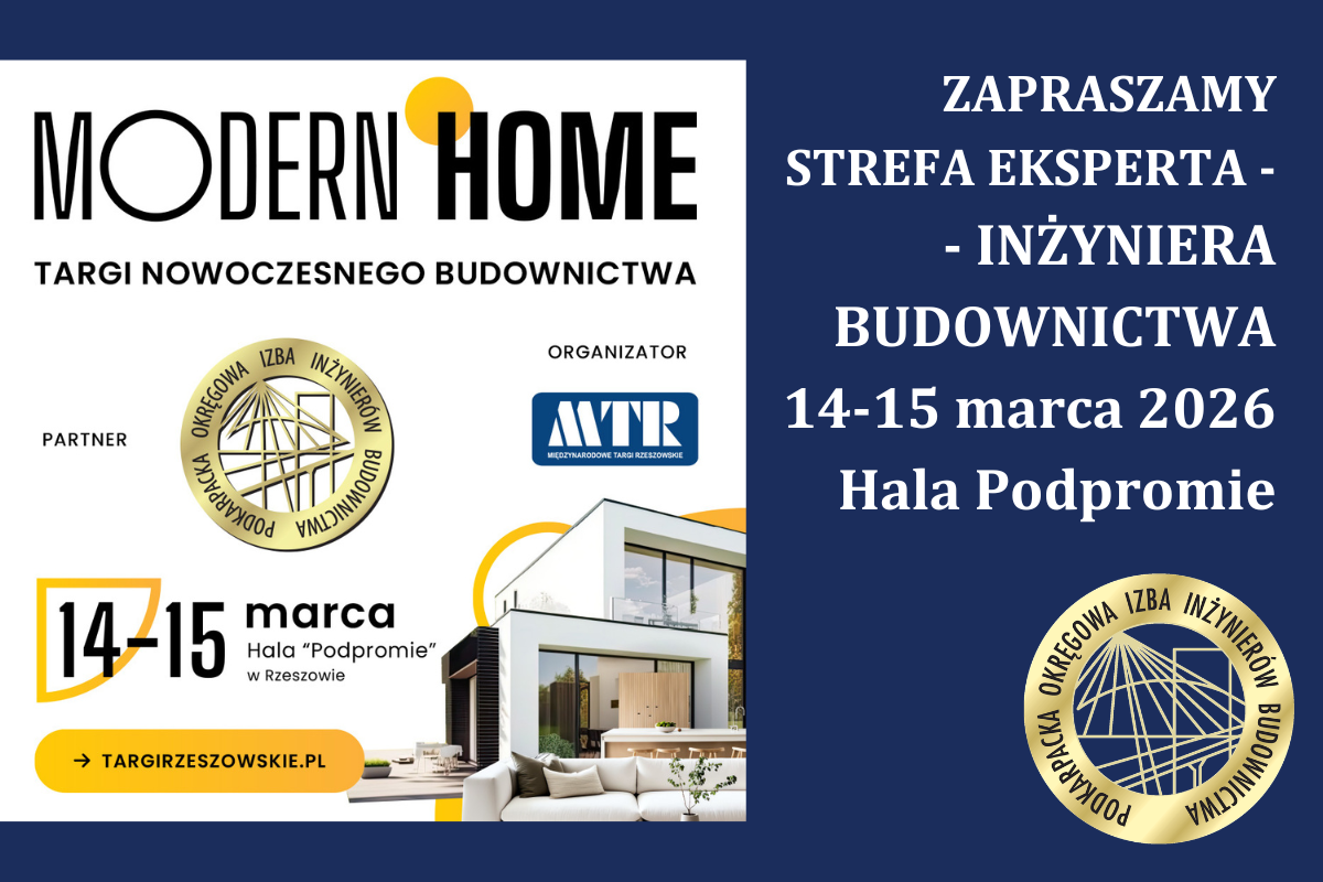 Podkarpacka Okręgowa Izba Inżynierów Budownictwa jako partner wydarzenia zaprasza na Targi Nowoczesnego Budownictwa Modern Home, które odbędą się w dniach 14 - 15 marca 2026 r. na Hali Podpromie w Rzeszowie. Spotkaj się z Inżynierem Budownictwa - inżynierowie - eksperci w specjalnej strefie będą prowadzić bezpłatne porady. ...więcej >> |