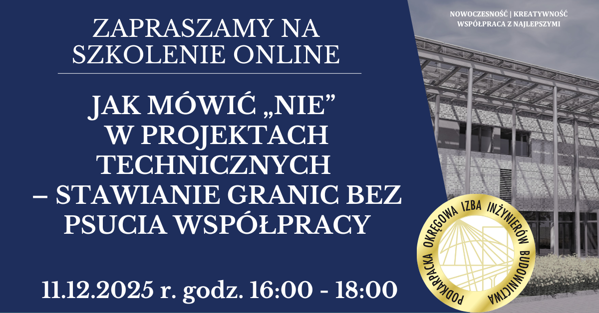 | Szkolenie on-line PDK OIIB - Jak mówić „nie” w projektach technicznych – stawianie granic bez psucia współpracy - 11.12.2025 r. |