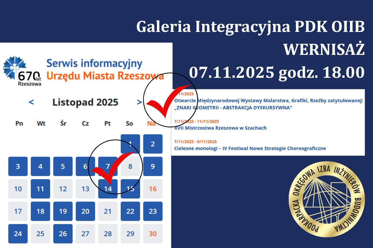 Serwis informacyjny Urzędu Miasta Rzeszowa - zaprasza do Galerii Integracyjnej PDK OIIB na otwarcie Międzynarodowej Wystawy Malarstwa, Grafiki, Rzeźby zatytułowanej: ZNAKI GEOMETRII - ABSTRAKCJA DYSKURSYWNA w dniu 07 listopada 2025 r. o godzinie 18.00 w siedzibie Podkarpackiej Okręgowej Izby Inżynierów Budownictwa. ...więcej>> |