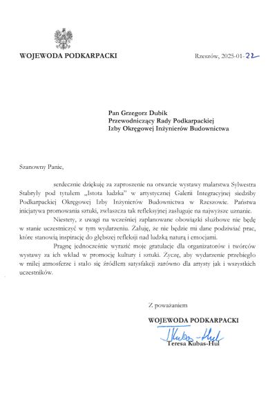W dniu 22 stycznia 2025 r. o godzinie 18.00 odbył się wernisaż i uroczyste otwarcie wystawy malarstwa Sylwestra Stabryły zatytułowanej Istota Ludzka w artystycznej Galerii Integracyjnej w siedzibie Podkarpackiej Okręgowej Izby Inżynierów Budownictwa w Rzeszowie, ul. Krakowska 289.