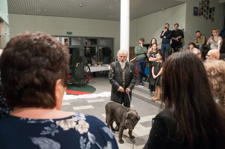 Wernisaż w Galerii Integracyjnej rozpoczął się od filmowego zaproszenia w podróż z artystą, zwiastun będący zarazem progiem i obrazem przed obrazem, zaproszeniem do ciszy, w której kolor zaczyna brzmieć. Kulminacją było opadnięcie kurtyny, odsłaniające niespodziankę: samego artystę w zabytkowej karocy, ze swym wiernym psem-towarzyszem. Ten teatralny, żywy obraz, któremu od pierwszej chwili towarzyszyły potężne tony organów, umieszczonych w holu stał się bramą, przez którą wkroczyliśmy w przestrzeń jego dzieł. W ten właśnie sposób Józef Jan Krużla powitał zgromadzonych gości i rozpoczęliśmy wspólną wędrówkę po światach tej wyjątkowej wystawy.