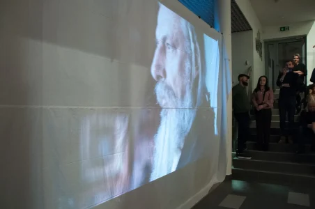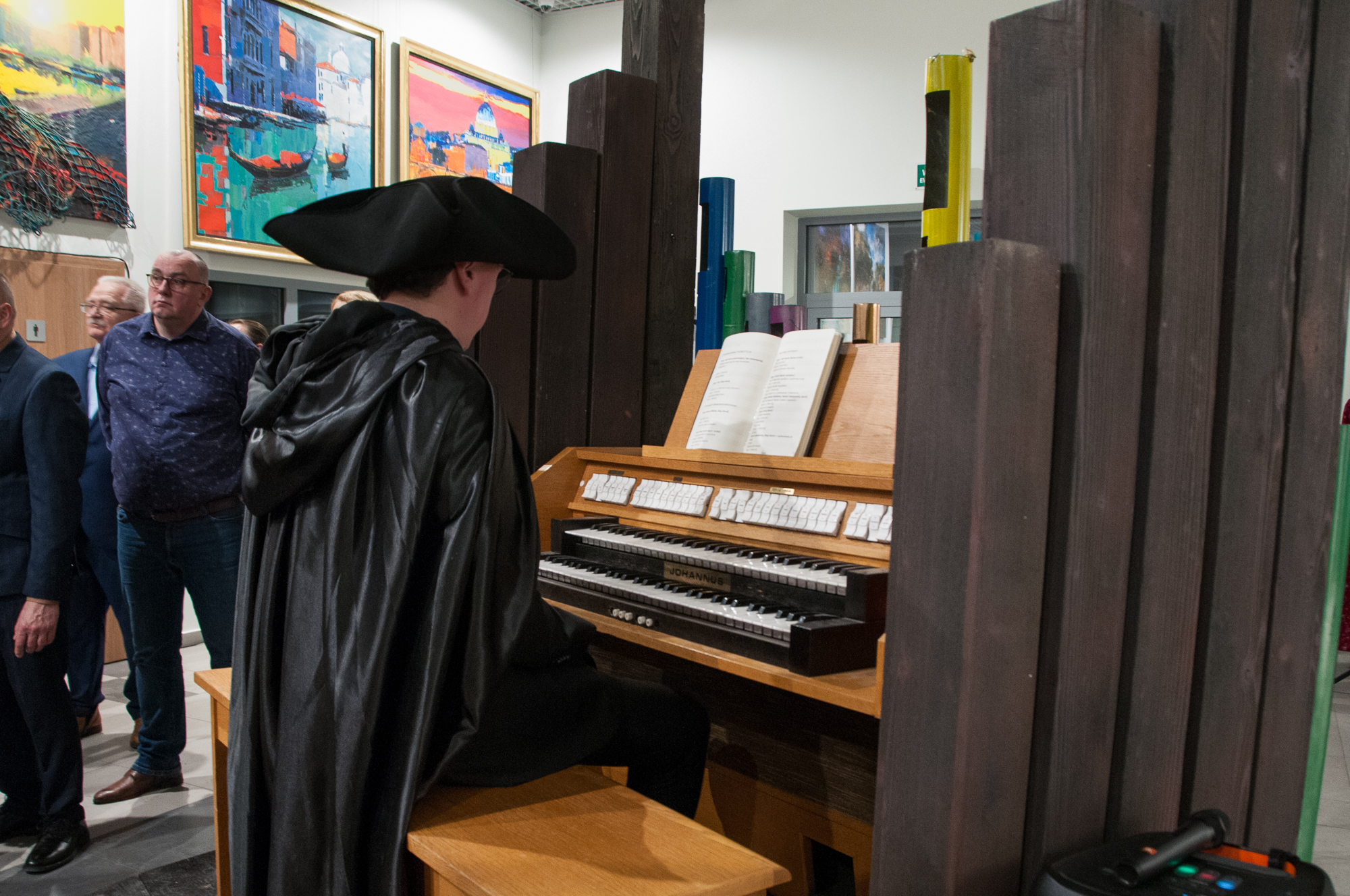 Wernisaż w Galerii Integracyjnej rozpoczął się od filmowego zaproszenia w podróż z artystą, zwiastun będący zarazem progiem i obrazem przed obrazem, zaproszeniem do ciszy, w której kolor zaczyna brzmieć. Kulminacją było opadnięcie kurtyny, odsłaniające niespodziankę: samego artystę w zabytkowej karocy, ze swym wiernym psem-towarzyszem. Ten teatralny, żywy obraz, któremu od pierwszej chwili towarzyszyły potężne tony organów, umieszczonych w holu stał się bramą, przez którą wkroczyliśmy w przestrzeń jego dzieł. W ten właśnie sposób Józef Jan Krużla powitał zgromadzonych gości i rozpoczęliśmy wspólną wędrówkę po światach tej wyjątkowej wystawy.