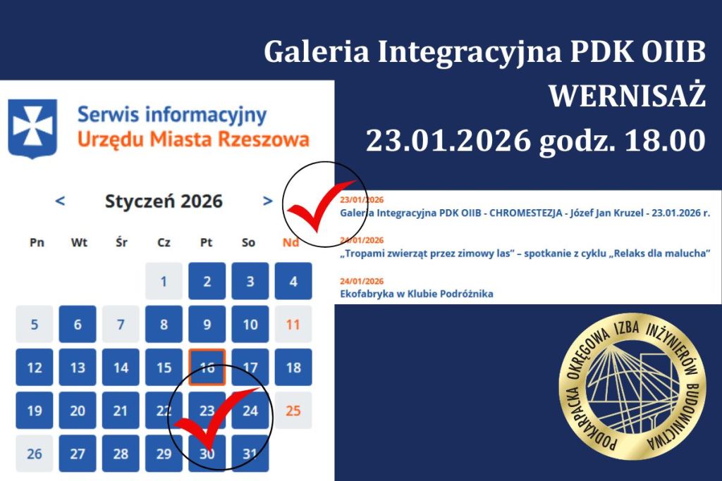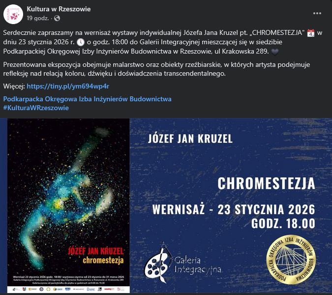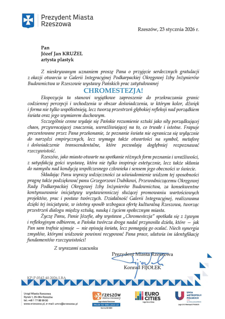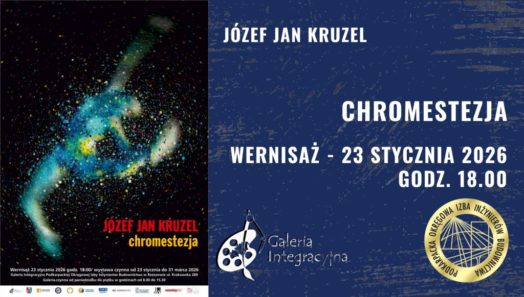 W dniu 23 stycznia 2026 r. o godz. 18:00 odbyło się otwarcie wystawy interdyscyplinarnej Józefa Jana Krużla pt. „CHROMESTEZJA” w Galerii Integracyjnej mieszczącej się w siedzibie Podkarpackiej Okręgowej Izby Inżynierów Budownictwa w Rzeszowie, ul Krakowska 289.