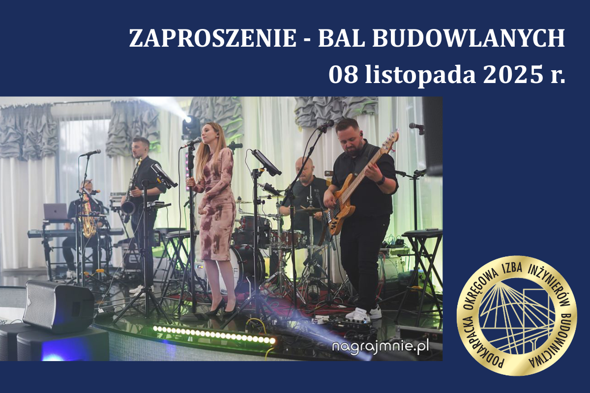 Podkarpacka Okręgowa Izba Inżynierów Budownictwa zaprasza swoich członków wraz z osobami towarzyszącymi w ramach Święta Budowlanych na Bal Budowlanych, który odbędzie się 08 listopada 2025 r. (sobota) od godz. 19.00 do białego rana w Rezydencji Alabaster w Rzeszowie ul. Ks. Stafieja 8. ...więcej>> |