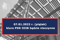 Uprzejmie informujemy, że w dniu 07.01.2022 r. (piątek) biuro PDK OIIB będzie nieczynne. Za wszelkie utrudnienia przepraszamy. |