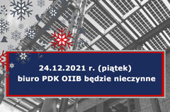 Uprzejmie informujemy, że w dniu 24.12.2021 r. (piątek) biuro PDK OIIB będzie nieczynne. Za wszelkie utrudnienia przepraszamy. |