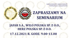 Firmy: JAFAR S.A., WILO POLSKA SP. Z O.O., HERZ POLSKA SP. Z O.O. wraz z Zarządem Oddziału Podkarpackiego PZITS w Rzeszowie oraz Podkarpacką Okręgową Izbą Inżynierów Budownictwa zapraszają na seminarium, które odbędzie się w dniu 17.12.2021r. (piątek) w godz. ... więcej »