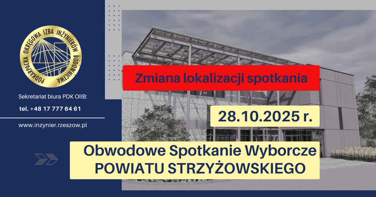 Z uwagi na remont w Domu Kultury „Sokół" w Strzyżowie, nastąpiła zmiana miejsca spotkania wyborczego. Serdecznie zapraszamy na spotkanie wyborcze członków Powiatu Strzyżowskiego Podkarpackiej Okręgowej Izby Inżynierów Budownictwa, które odbędzie się w dniu 28 października o godzinie 17:00 w Muzeum ... więcej »
