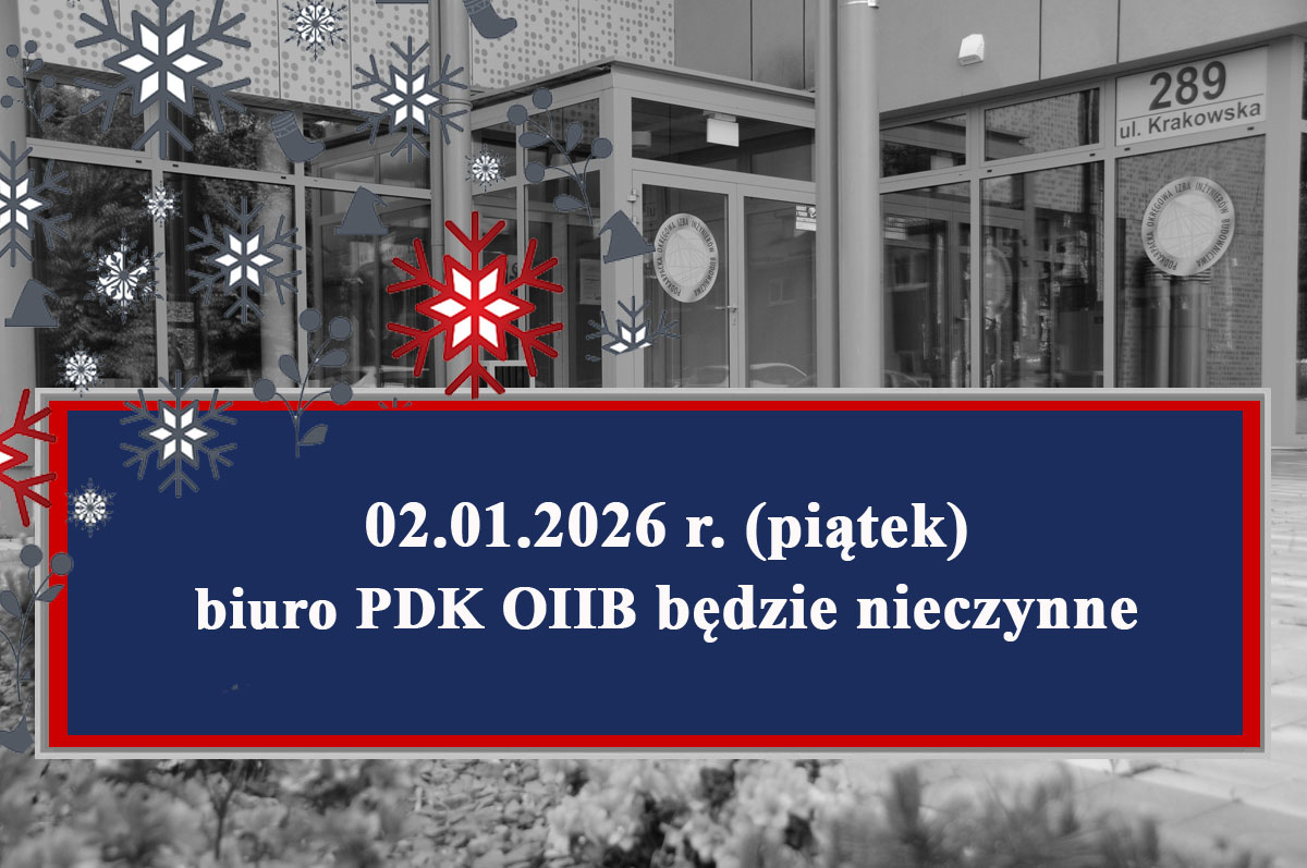 Uprzejmie informujemy, że w dniu 02.01.2026 r. (piątek) biuro PDK OIIB będzie nieczynne. Za wszelkie utrudnienia przepraszamy. |