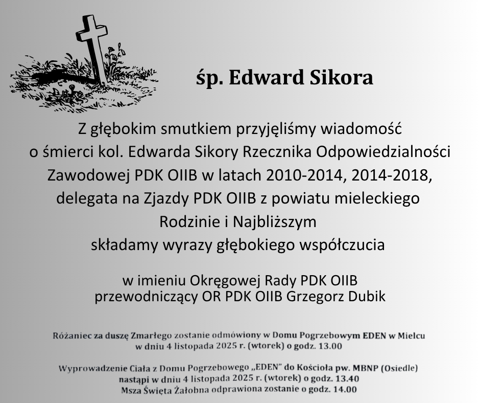 Z głębokim smutkiem przyjęliśmy wiadomość o śmierci kol. Edwarda Sikory Rzecznika Odpowiedzialności Zawodowej PDK OIIB w latach 2010-2014, 2014-2018, delegata na Zjazdy PDK OIIB z powiatu mieleckiego Rodzinie i Najbliższym składamy wyrazy głębokiego współczucia