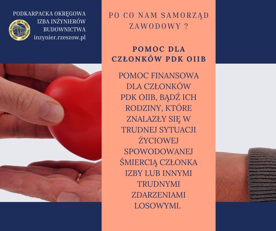 Pomoc Finansowa Członków PDK OIIB, Bądź ich Rodziny, Które Znalazły Się w Trudnej Sytuacji Życiowej. Pomoc finansowa jest przeznaczona dla członków Podkarpackiej OIIB oraz ich rodzin, które doświadczyły trudnych zdarzeń losowych, takich jak śmierć członka izby, poważna choroba, wypadek, czy inne nagłe i nieprzewidziane sytuacje życiowe. Celem pomocy finansowej jest wsparcie w pokryciu kosztów leczenia, rehabilitacji lub innych istotnych wydatków związanych z trudną sytuacją życiową. |
