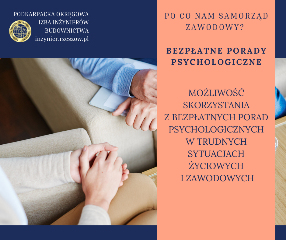 Bezpłatne Porady Psychologiczne. Możliwość skorzystania z pięciu bezpłatnych porad psychologicznych dla inżynierów budownictwa znajdujących się w trudnej sytuacji życiowej lub zawodowej. Środowisko inżynierskie wiąże się z dużą odpowiedzialnością, presją czasu oraz koniecznością podejmowania decyzji pod presją. Choć często jesteśmy ... więcej » |
