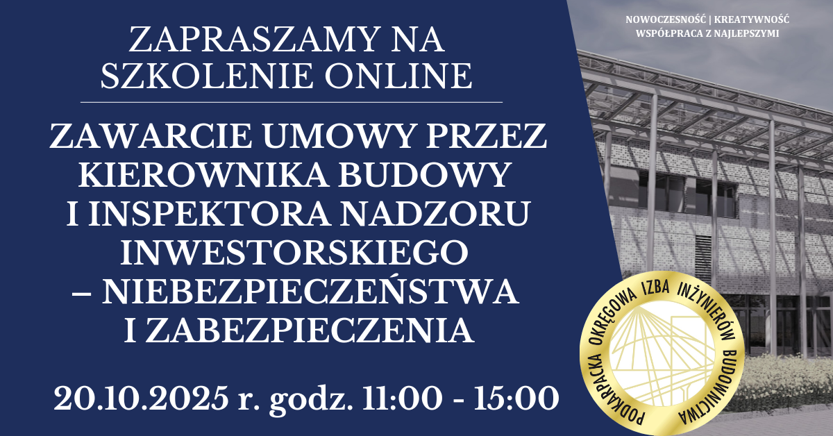 Szkolenie on-linie PDK OIIB - Zawarcie umowy przez kierownika budowy i inspektora nadzoru inwestorskiego – niebezpieczeństwa i zabezpieczenia - 20.10.2025 r. |